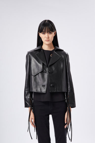 Elevate your style with this chic leather crop jacket. Features trench flap details and frilled cuffs, blending edgy and elegant elements for a standout look. Perfect for any fashion-forward wardrobe.