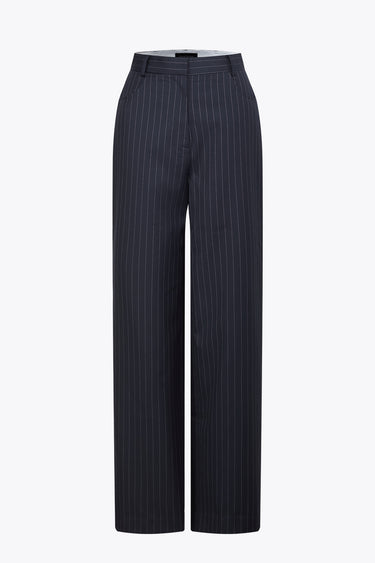 Classic navy pinstripe trousers featuring a tailored, sleek silhouette and mid-rise fit. The timeless vertical stripes enhance a slimming effect, perfect for both business and smart-casual occasions.
