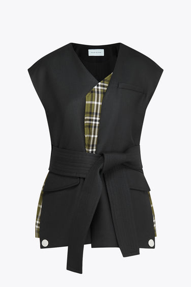 The gilet is sleeveless, dark-colored, with a plaid lining, front pockets, a chest pocket, a v-neck, and an adjustable waist belt, blending casual and tailored styles.