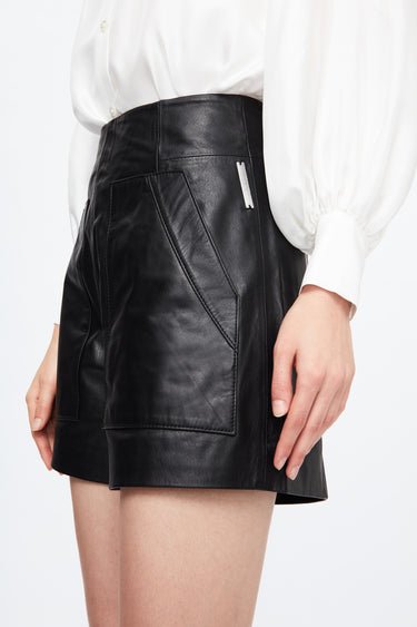 Sleek black leather shorts featuring oversized pockets, a high waist, and tailored fit. Perfect for adding an edgy, sophisticated touch to any ensemble. Ideal for day-to-night versatility.